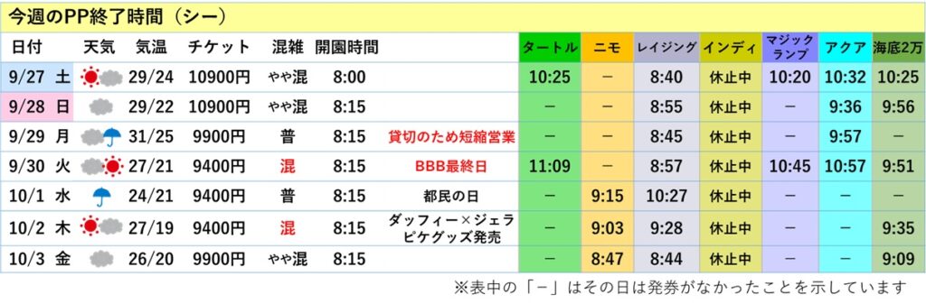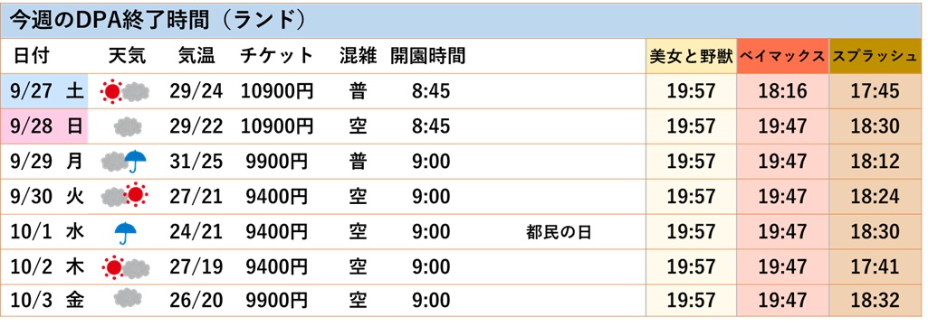 2025年9月27日〜10月3日のディズニーランド&ディズニーシーのDPA・プライオリティパス終了時間まとめバナー画像 DPA・PP終了時間まとめ