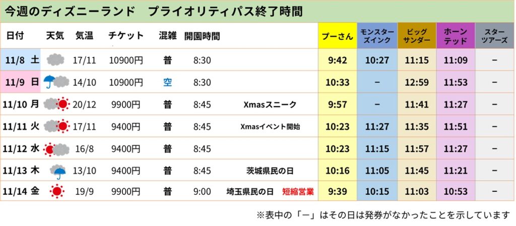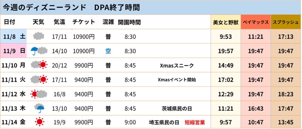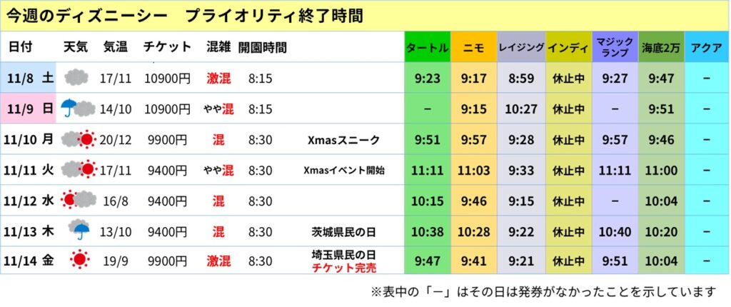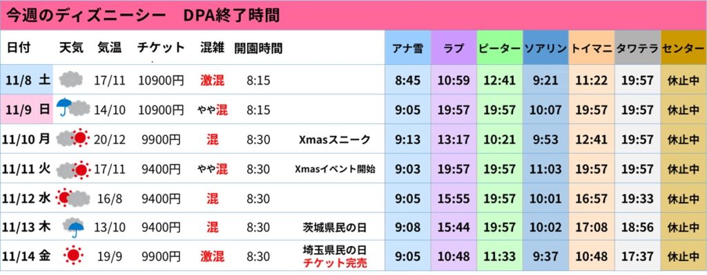 一方、ディズニーシーは週を通して混雑が継続しています。特に11/14(金)はディズニーランドの貸切営業に伴い夕方閉園の影響で、平日ながら”激混”となったようでした。