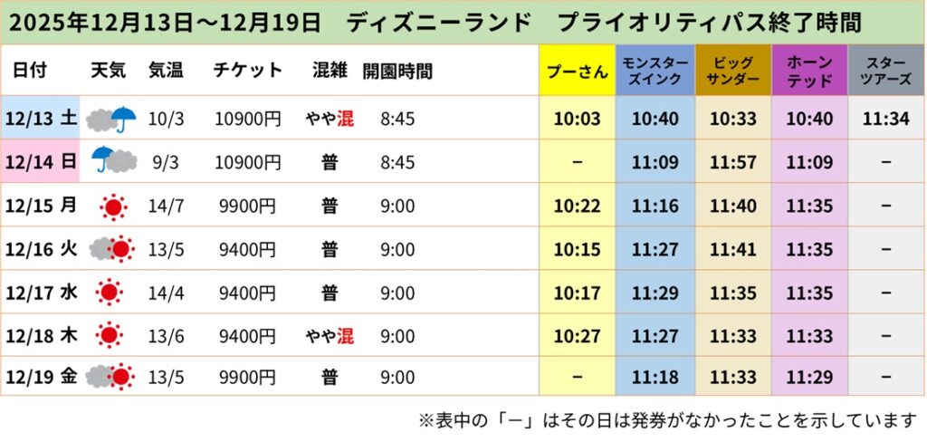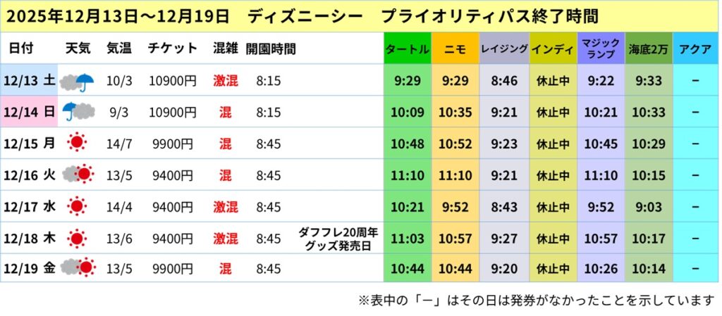 ・今週(12/13〜12/19)は、アナ雪が開園後30〜45分で終了。