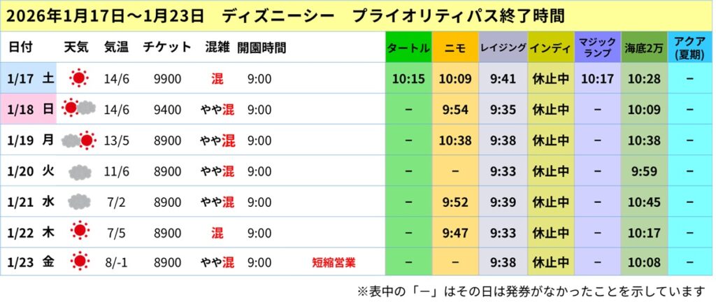 シーのプライオリティパスは、今週も混雑度の緩和に伴ってか、発券施設が限定されていました。1/17(土)のみ5施設発行されていましたが、それ以外は2~3施設の発行に留まっています。
