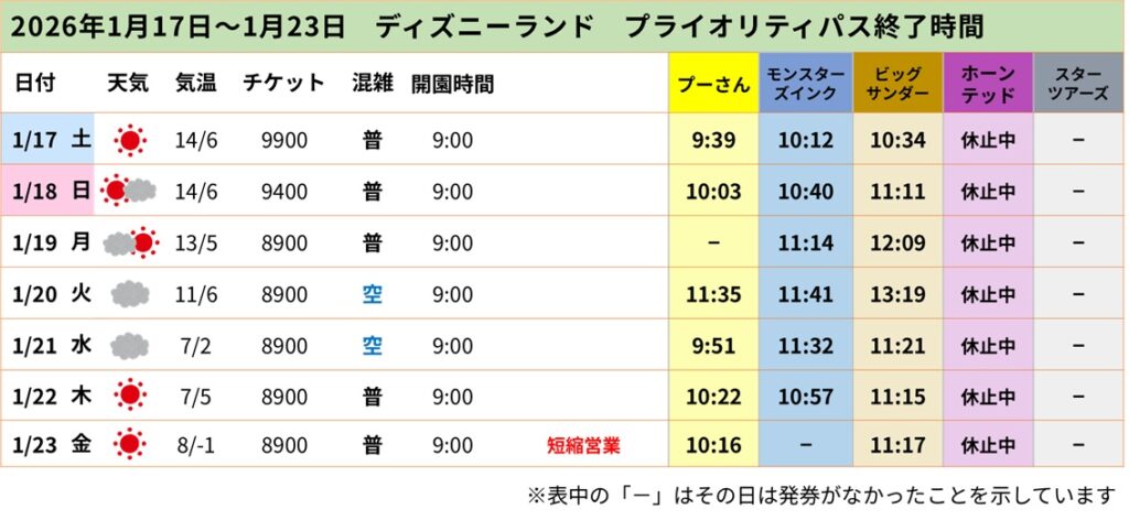 ただ、ホーンテッドマンションが1/13から運休(2/19再開予定)に入った影響か、以前は混雑度が高くない日は12~13時台まで何かしらのパスが残っている状況が多かったですが、11~12時頃に終了する日が増えてきています。